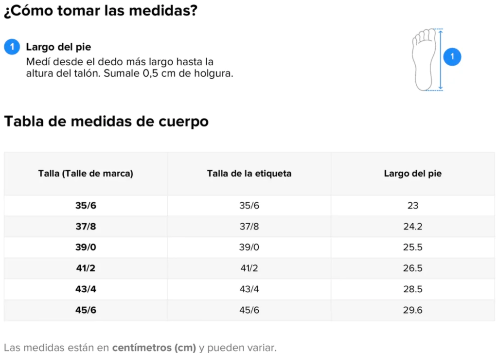 Según tu largo y el calce indicado en la descripción del producto: Ubicá el talle que mejor se adapte a tu pie según la guía de talles.